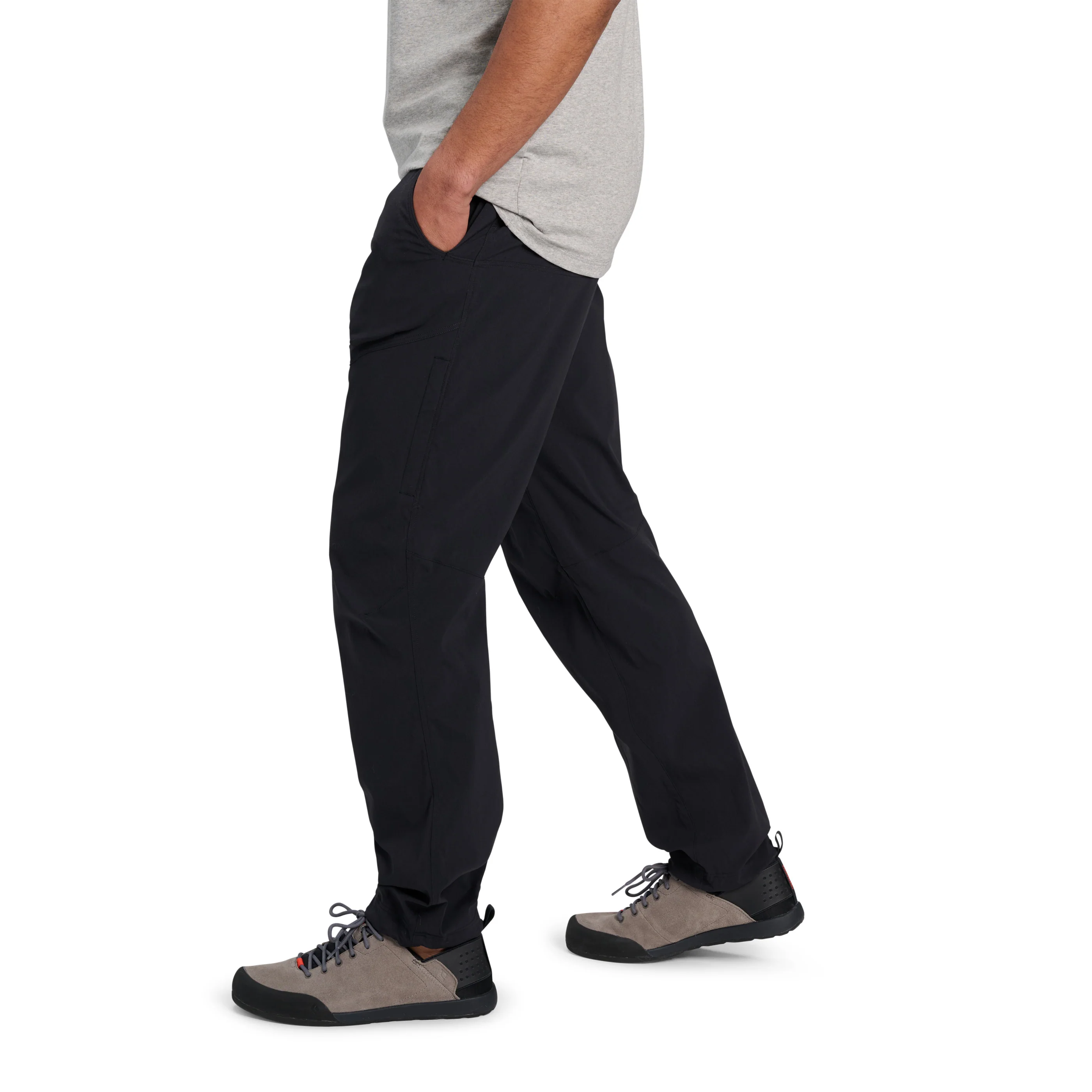 Функционалните детайли включват клиновиден шев отвътре за удобство при по‑високи крачки и артикулирани колене за лесно катерене по камъни, както и регулируема долна част на крачола, подходяща за колоездене или катерене. Правият силует е комбиниран с практични джобове — два предни джоба, два задни и един скрит джоб с цип на бедрото за закуска или телефон.